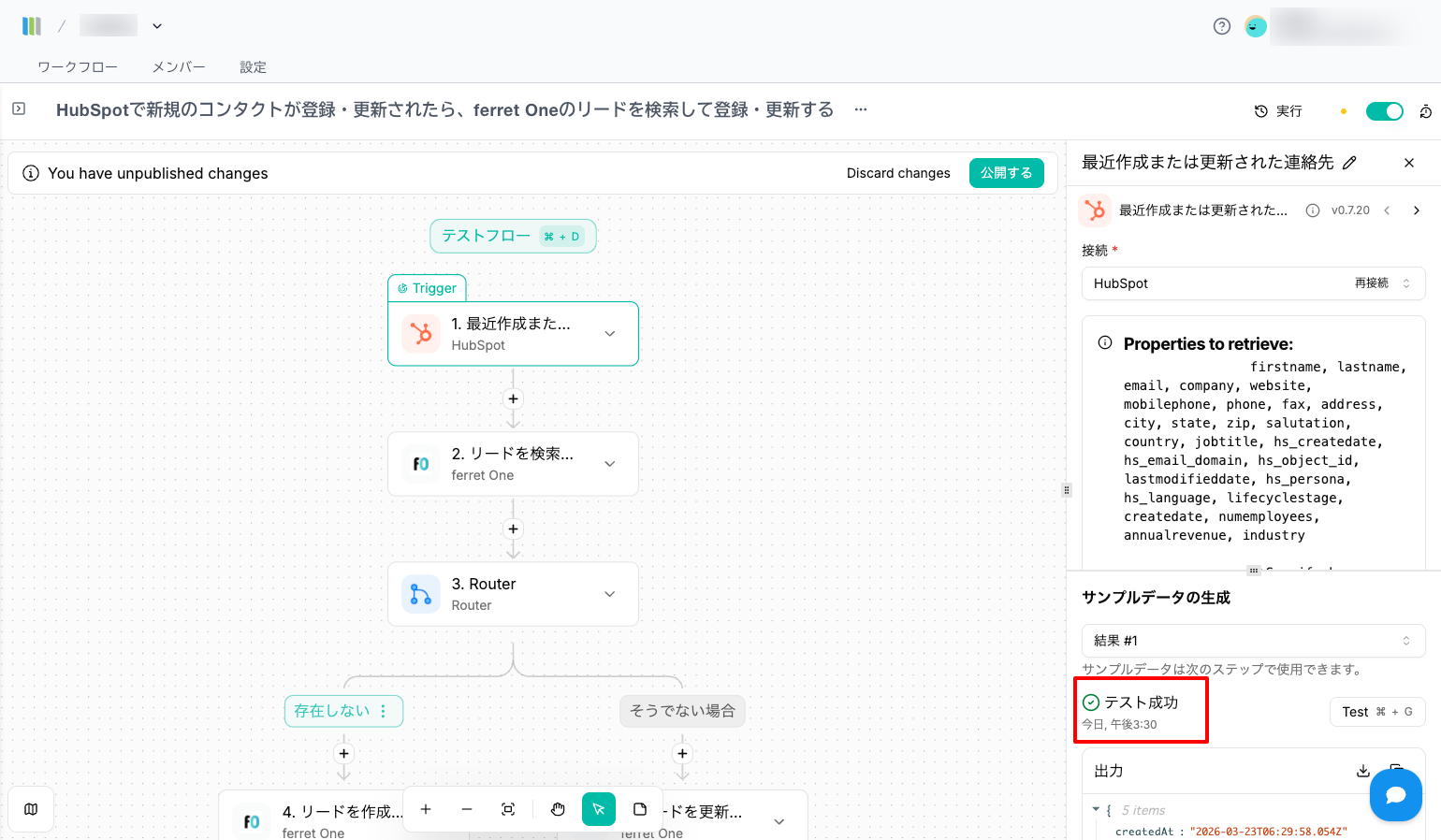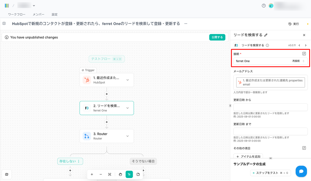 HubSpotで新規のコンタクトが登録・更新されたらferret Oneのリードを検索し、登録・更新する