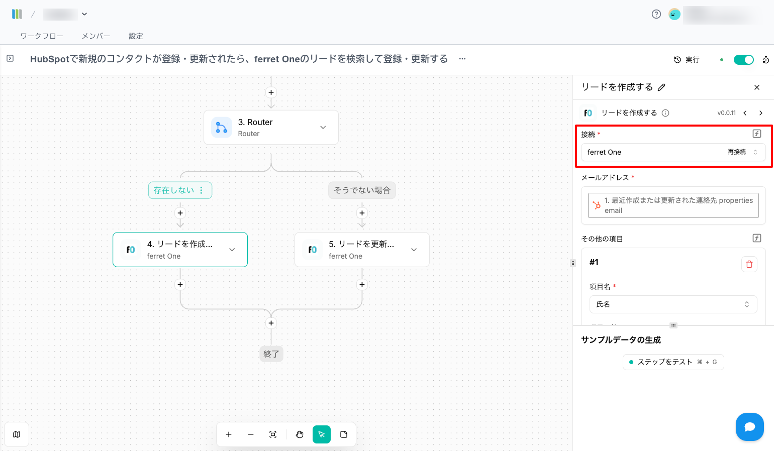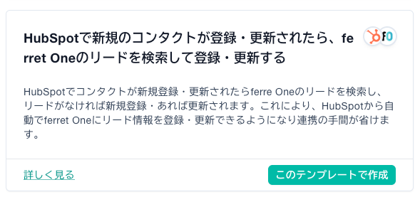 - 「HubSpotで新規のコンタクトが登録・更新されたらferret Oneのリードを検索し、登録・更新する」というテンプレから作るとスムーズです