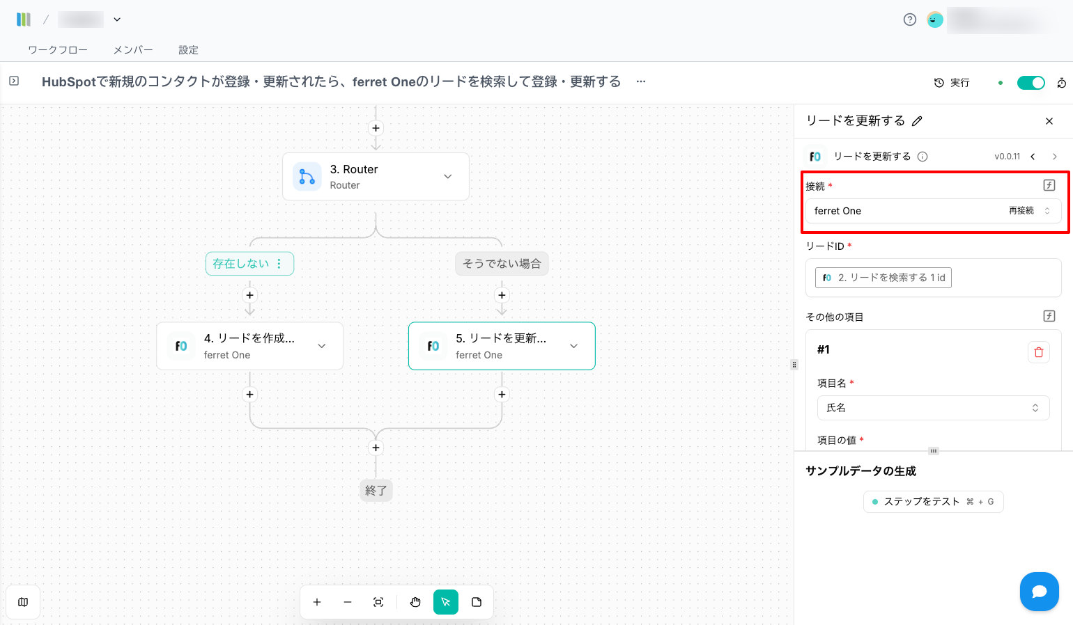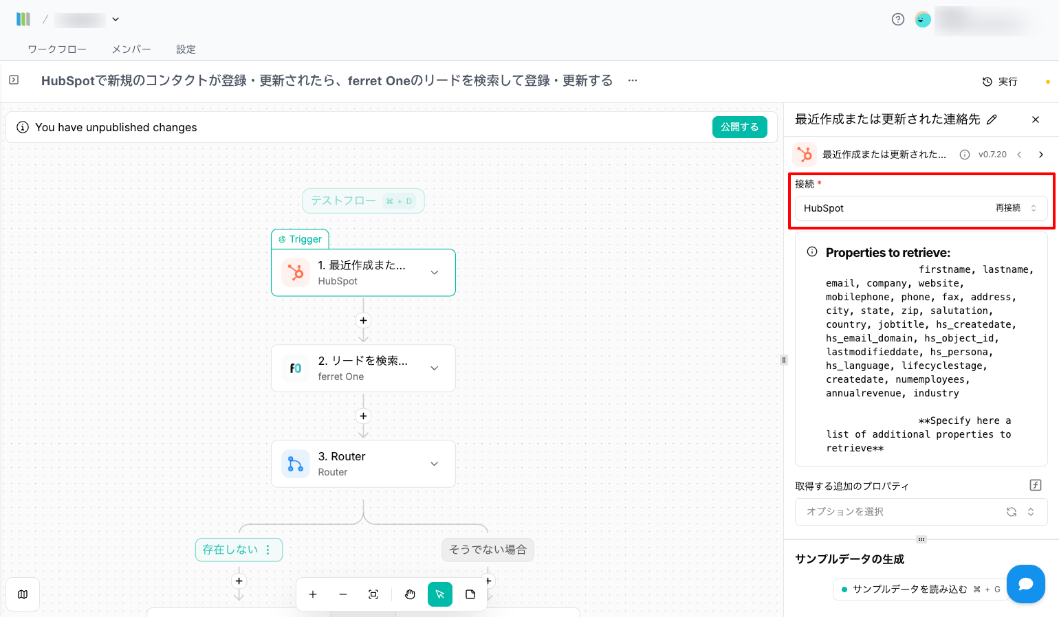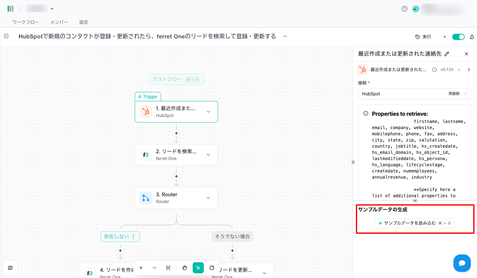 このワークフローでは、HubSpot内のリード情報の更新をトリガーにして、ferret Oneへリードを自動登録・更新をおこないます。