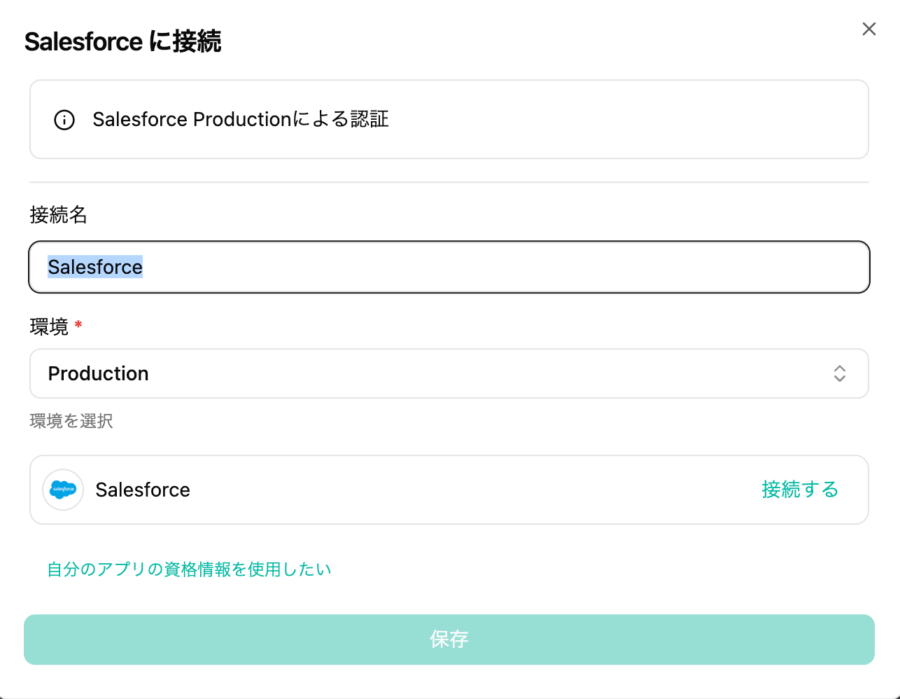 このピースでできることSalesforceの接続方法1. 接続を作成2. 接続設定3. AuthenticatorでSalesforceにログインし、許可を行う。4. 「保存」を押して接続名が設定されていることを確認する。ピースの設定項目1. オブジェクト(必須)2. WHERE句(必須)
