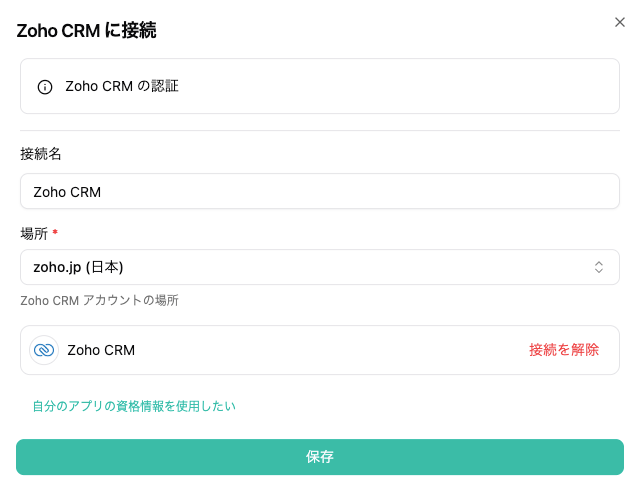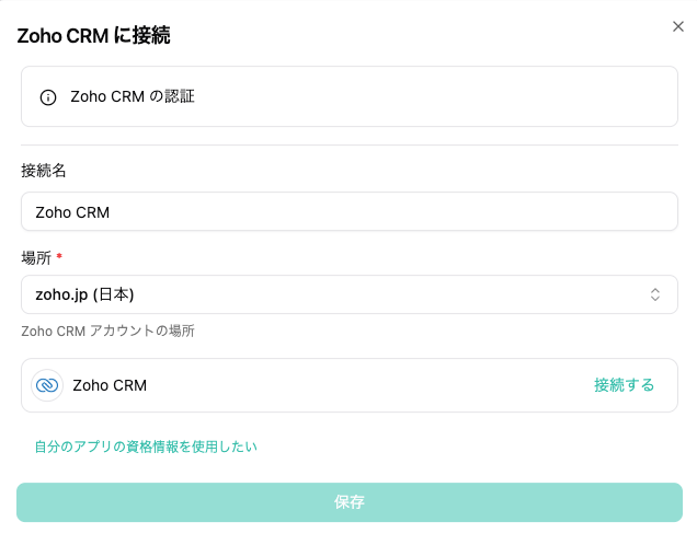 - 接続名を設定し、Zoho CRMのプロフィール欄を参考に場所を入力して(オプションを選択から選択可能です)「接続する」をクリックします。