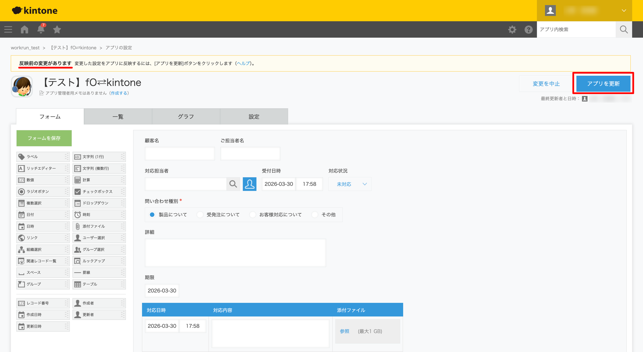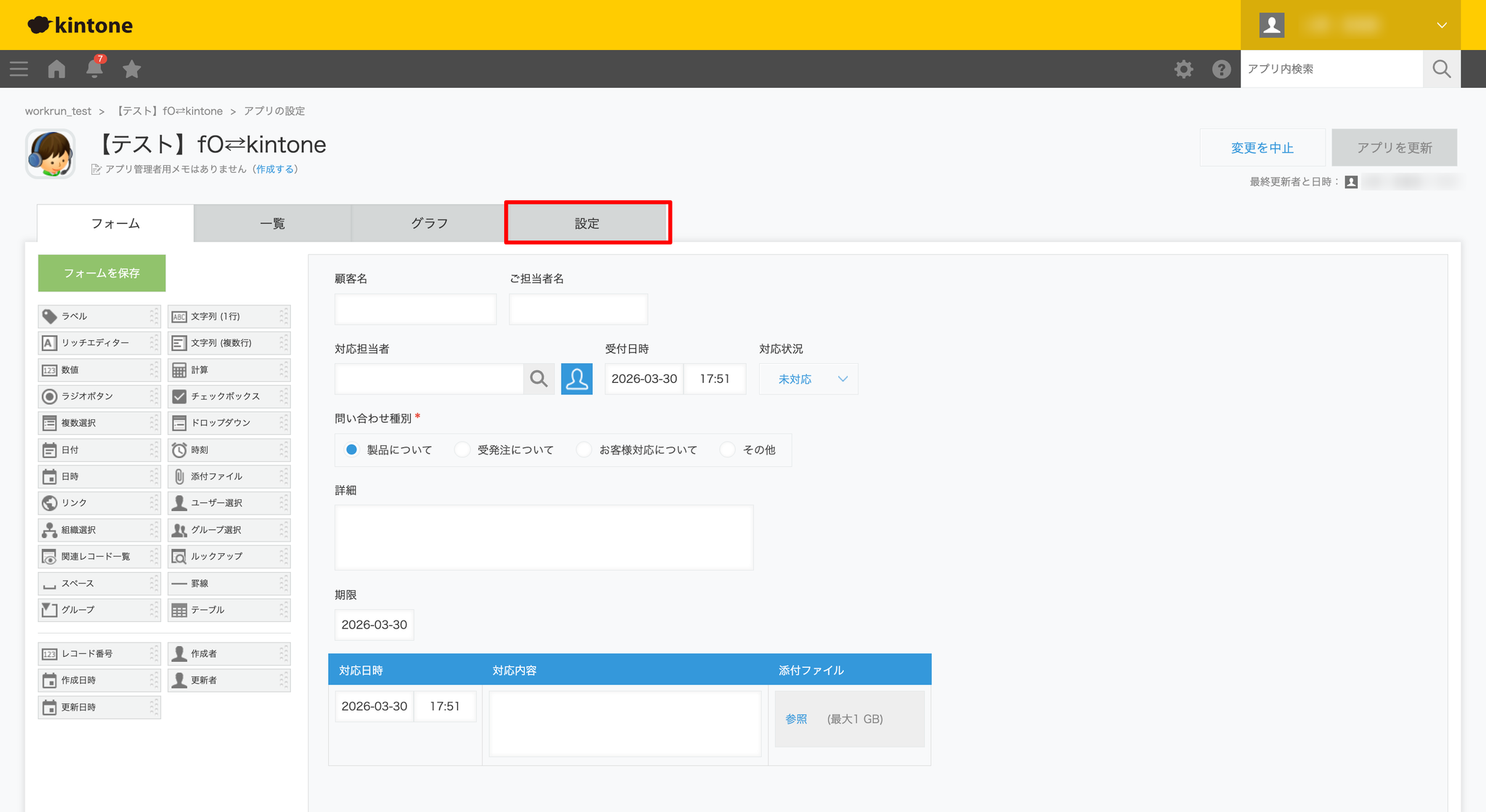 - ここで表示される入力項目は、kintoneアプリのフォーム定義から自動で読み取られて動的に生成されます。