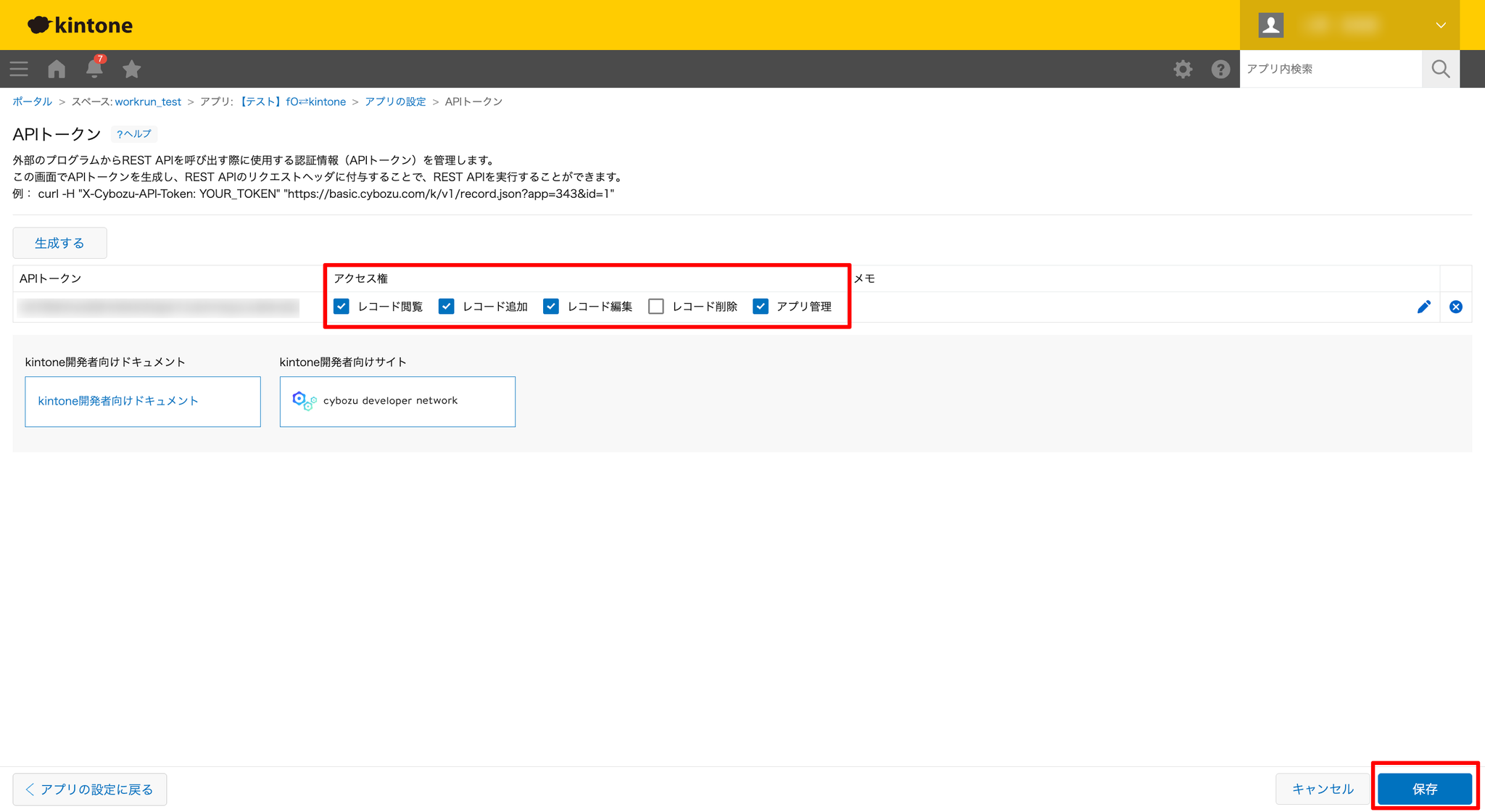 - APIトークンのアクセス権で「レコードを削除」を有効にしていると、レコードが自動的に削除される可能性があります。誤作動を防ぐためにも、「レコードを」削除のアクセス権は無効化させておくことを推奨いたします。