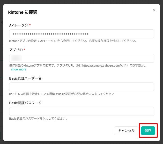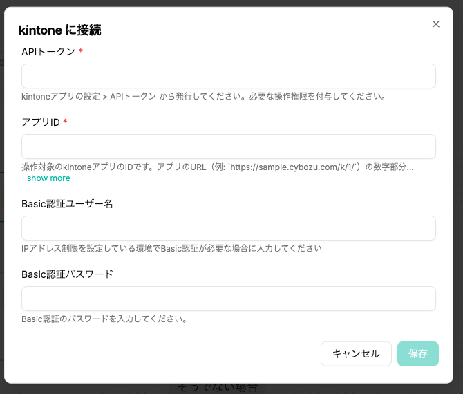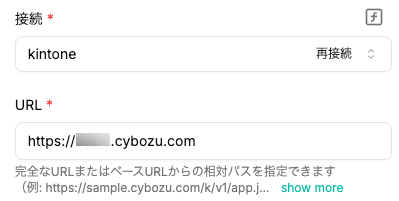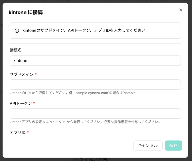 - 「kintoneに接続」の画面に切り替わったら、必須項目を入力していきます。