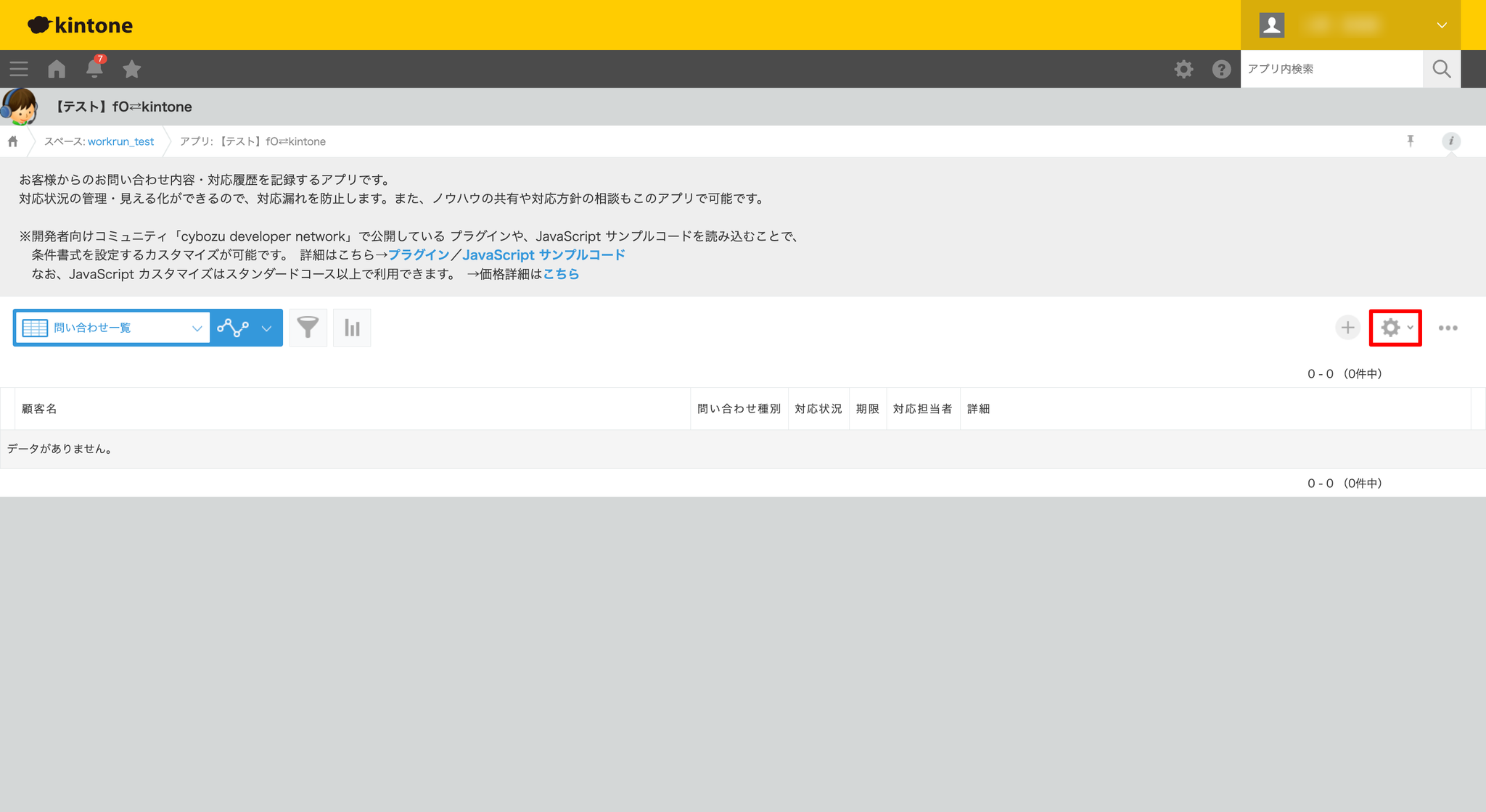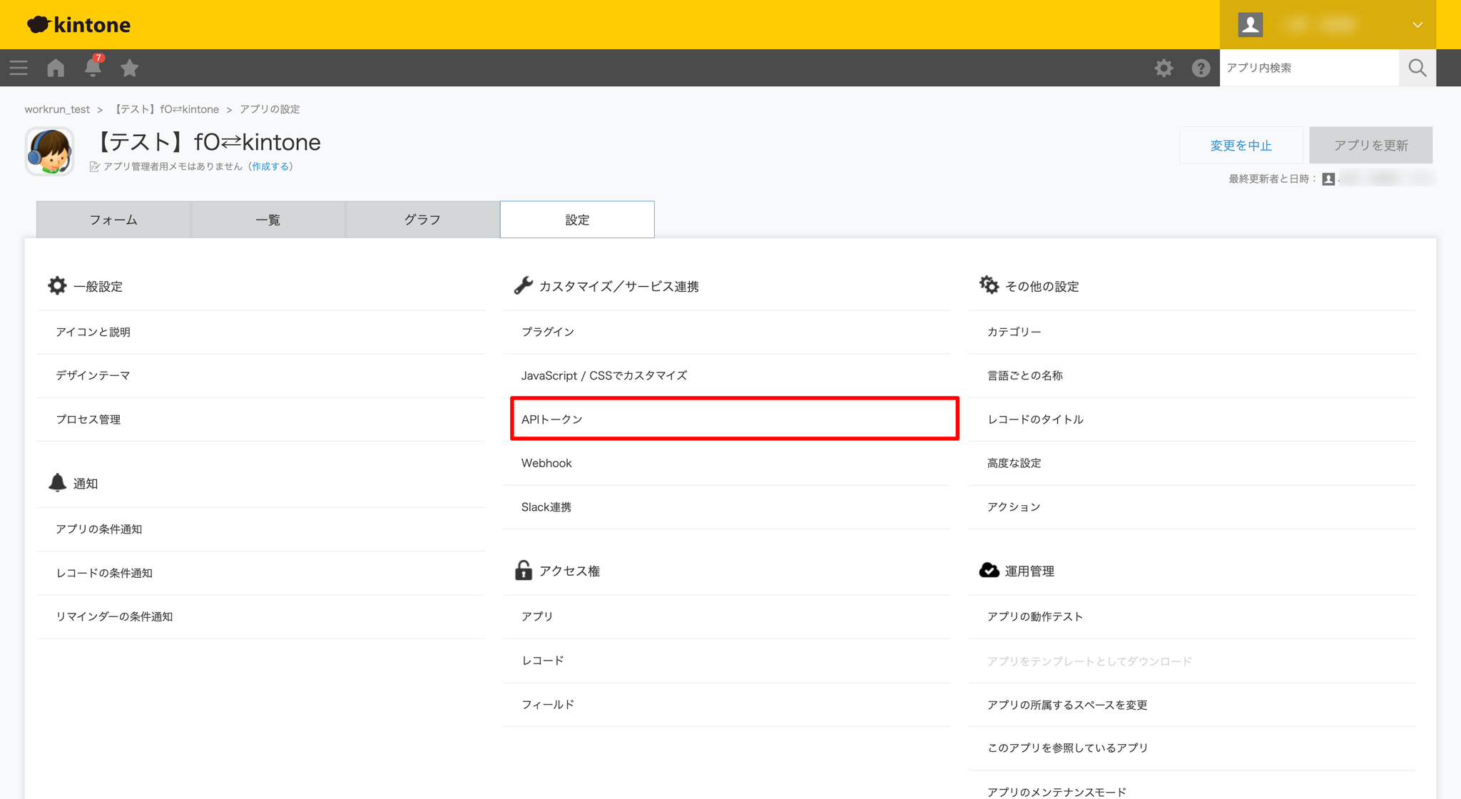 - 「APIトークン」はアプリの管理者権限を保有するユーザーのみが確認できます。kintoneアプリ内の歯車マークの設定から「APIトークン」を選択してください。※画面上部にあるkintone側の設定メニューからは確認できないので、ご注意ください。