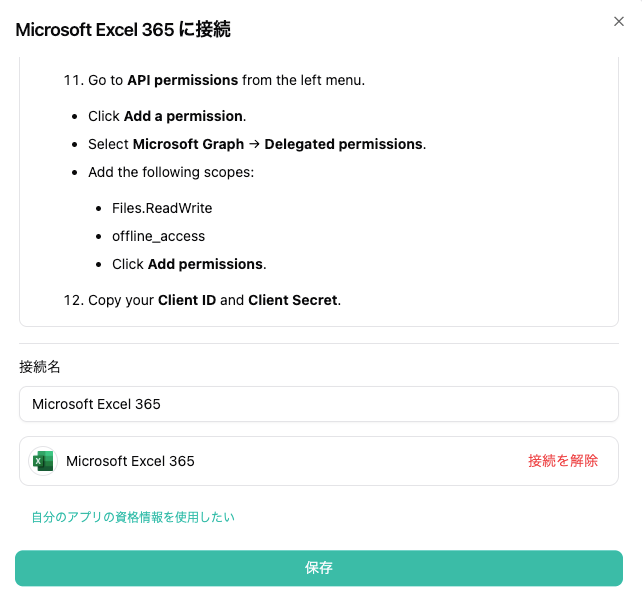 このピースでできることMicrosoft Excel 365の接続方法1. 接続を作成2. 接続設定3. Excelへのアクセス許可を与えます4. 「保存」を押して接続名が設定されていることを確認しますピースの設定項目1. ワークブックID(必須)2. ワークシート名(任意)3. ヘッダー(任意)4. 失敗時に続ける(任意)5.失敗時に再試行(任意)